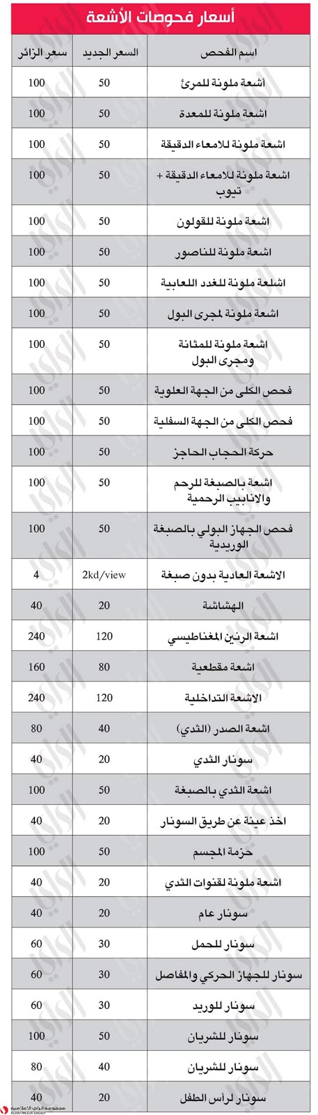 ووفقاً لقائمة الأسعار الجديدة، فقد ارتفع سعر سونار الحمل إلى 30 ديناراً بعد أن كان 10 دنانير فقط، وبات رسم الأشعة المقطعية 80 ديناراً مقابل 120 ديناراً لأشعة الرنين المغناطيسي.